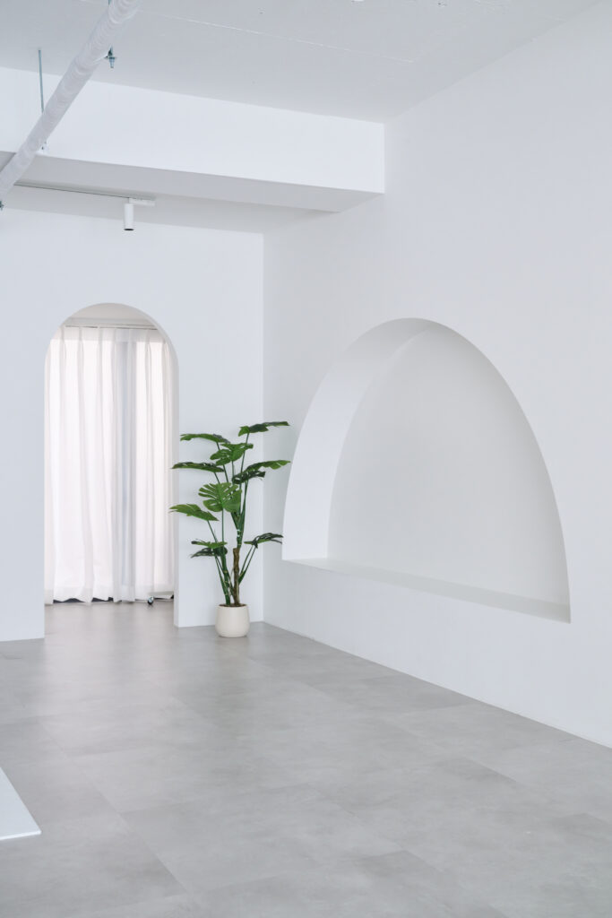 やわらかな曲線を描くアーチは、空間に立体感を加えるアクセント。ベンチのように腰かけて撮影もでき、さまざまな構図に対応します。
